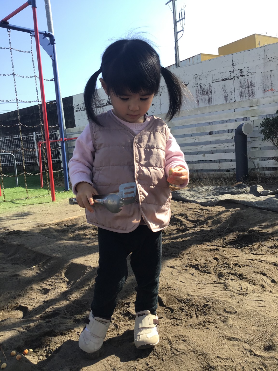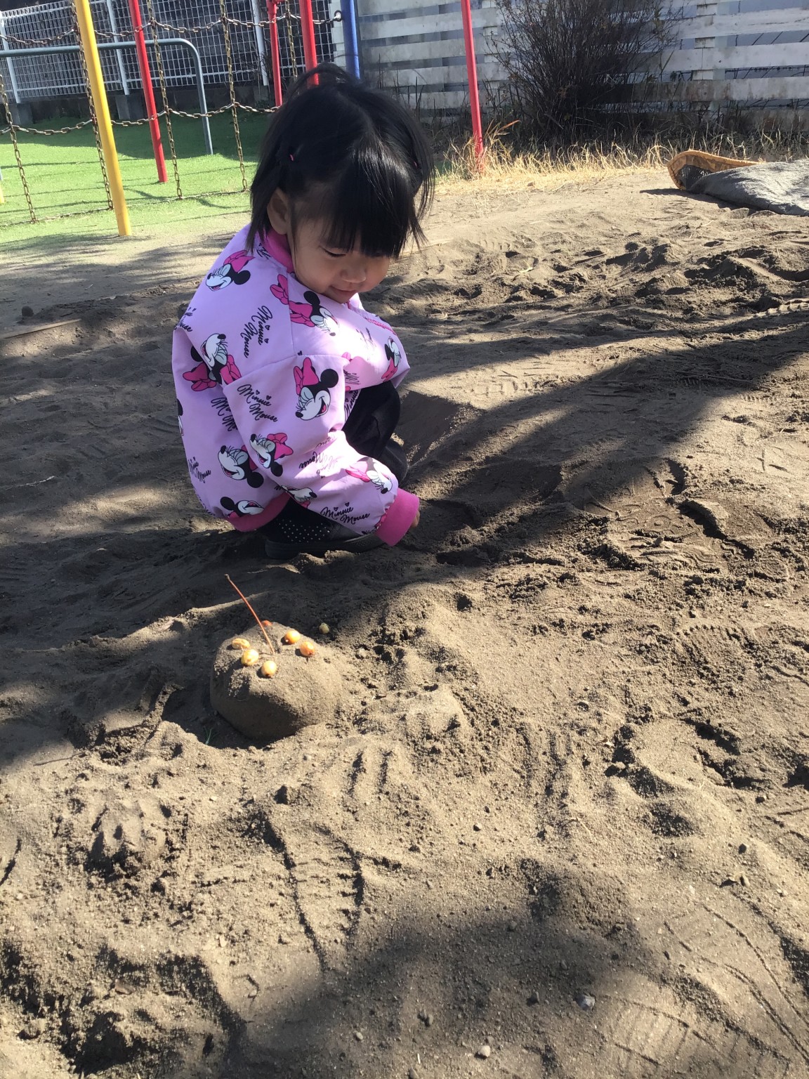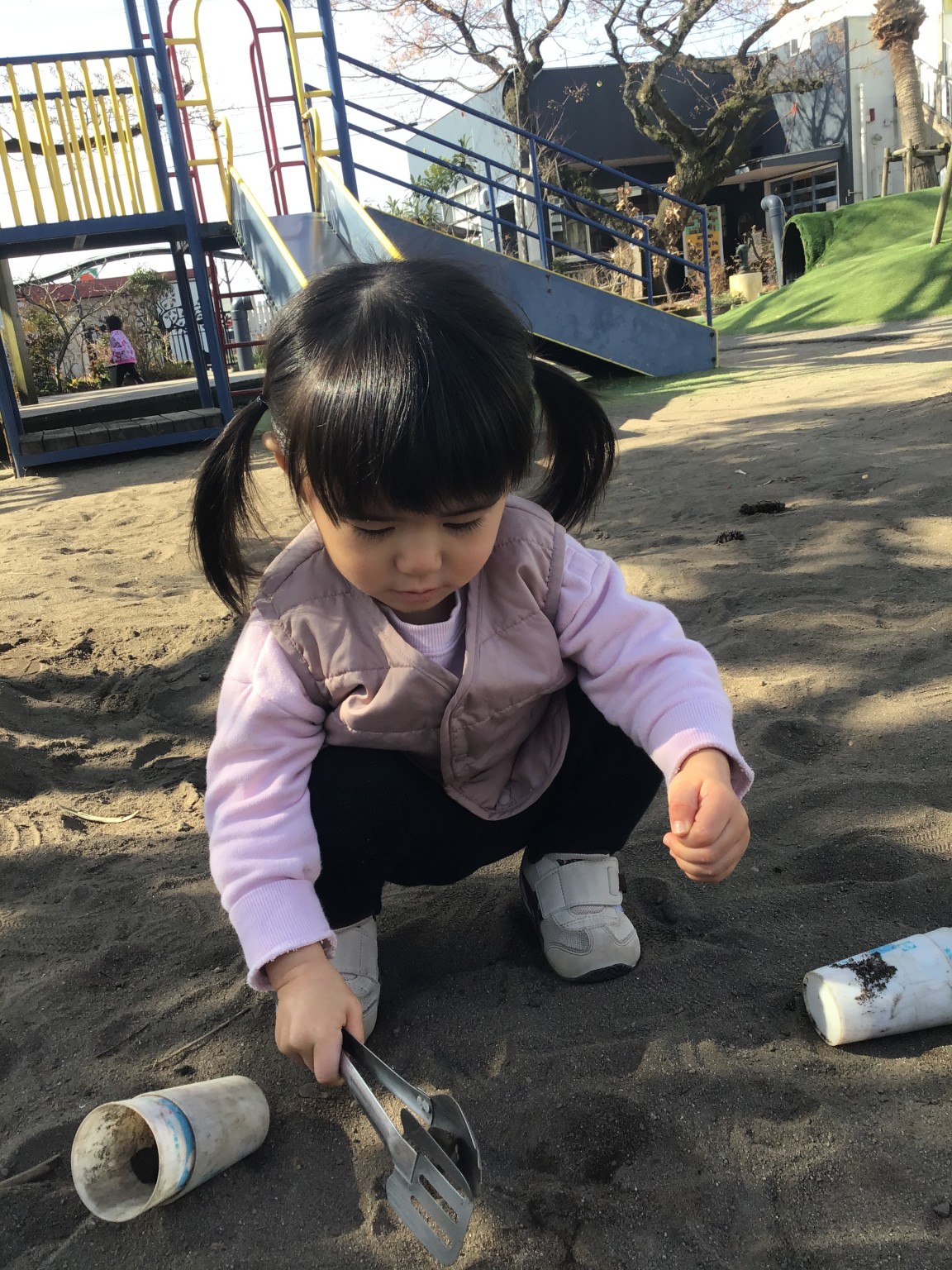 2/2 お外で遊ぼう 2026年2月3日 風が吹くと少し肩をすくませるような日和でしたが, お友達は元気に砂場へ駆け出して行きました♪ 幼稚園のお友達が作っていた美味しそうなケーキや ドーナツなどがあると,食べる真似をしたり 豆をトッピングしたり夢中で遊んでくれました☺️