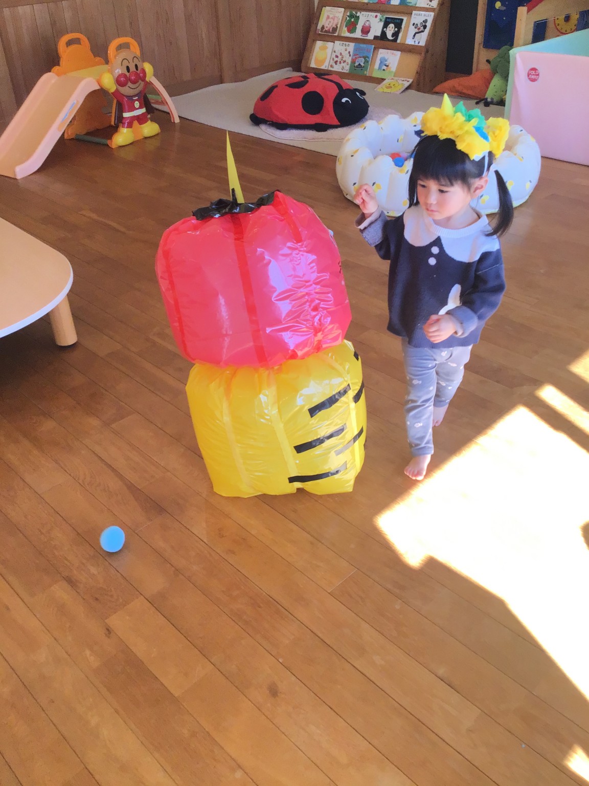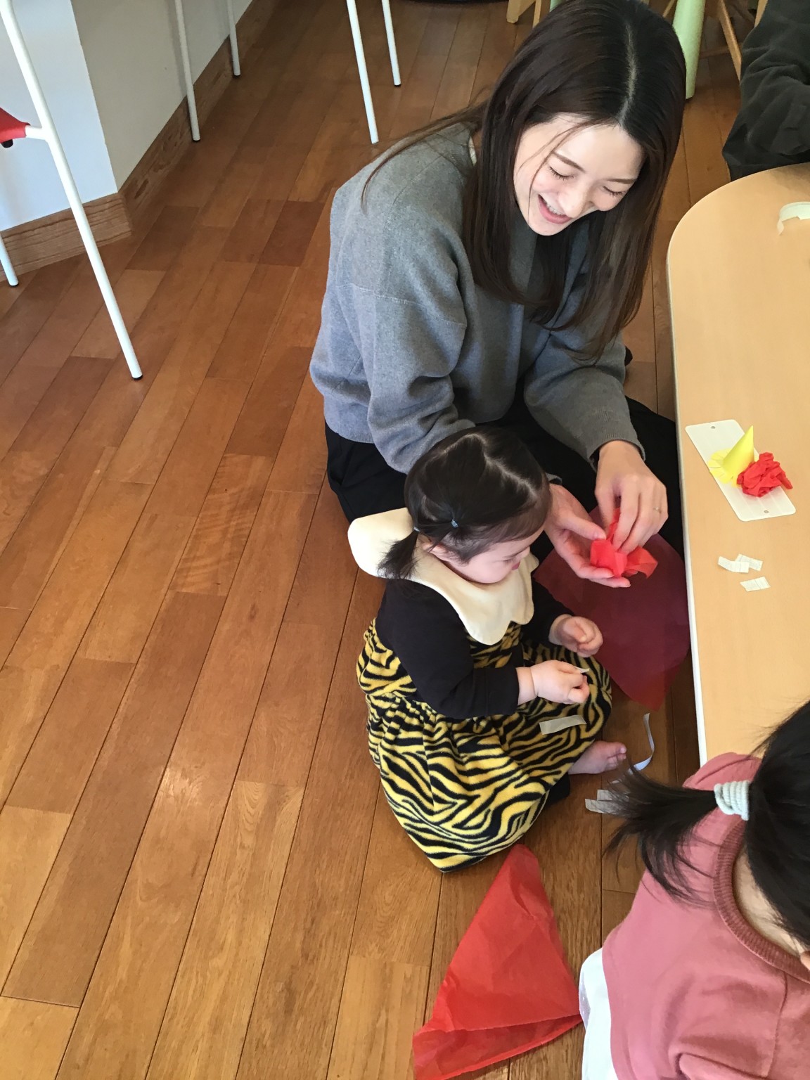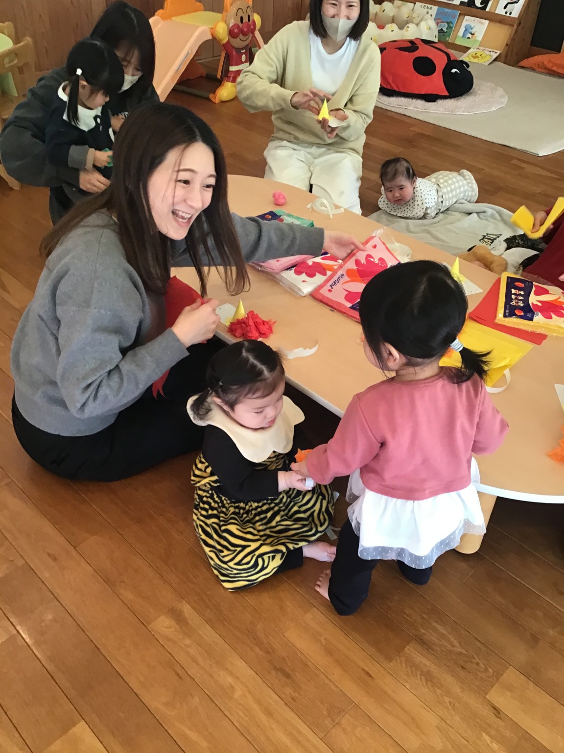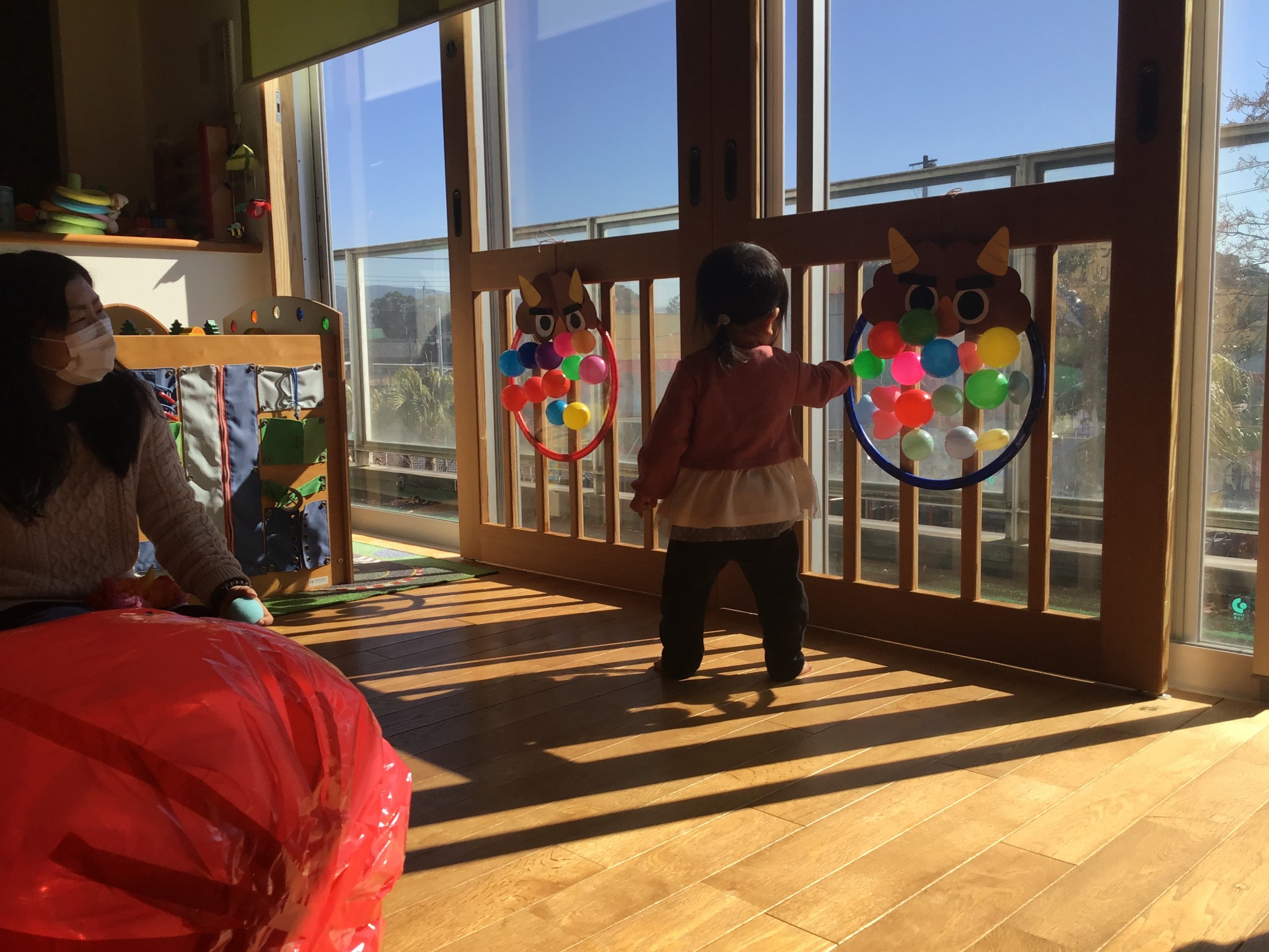 鬼のお面作り 2026年2月3日 今日は節分👹 鬼のお面作りをしました♪ お花紙を丸めてペタペタ付けると かわいい飾りが出来上がり! 鬼の飾りを頭に付けて鬼の飾りにボールを投げてくれました。 鬼の飾りを見て少し怖いーと顔をひきつらせていましたが 一生懸命ボールを投げてくれました。