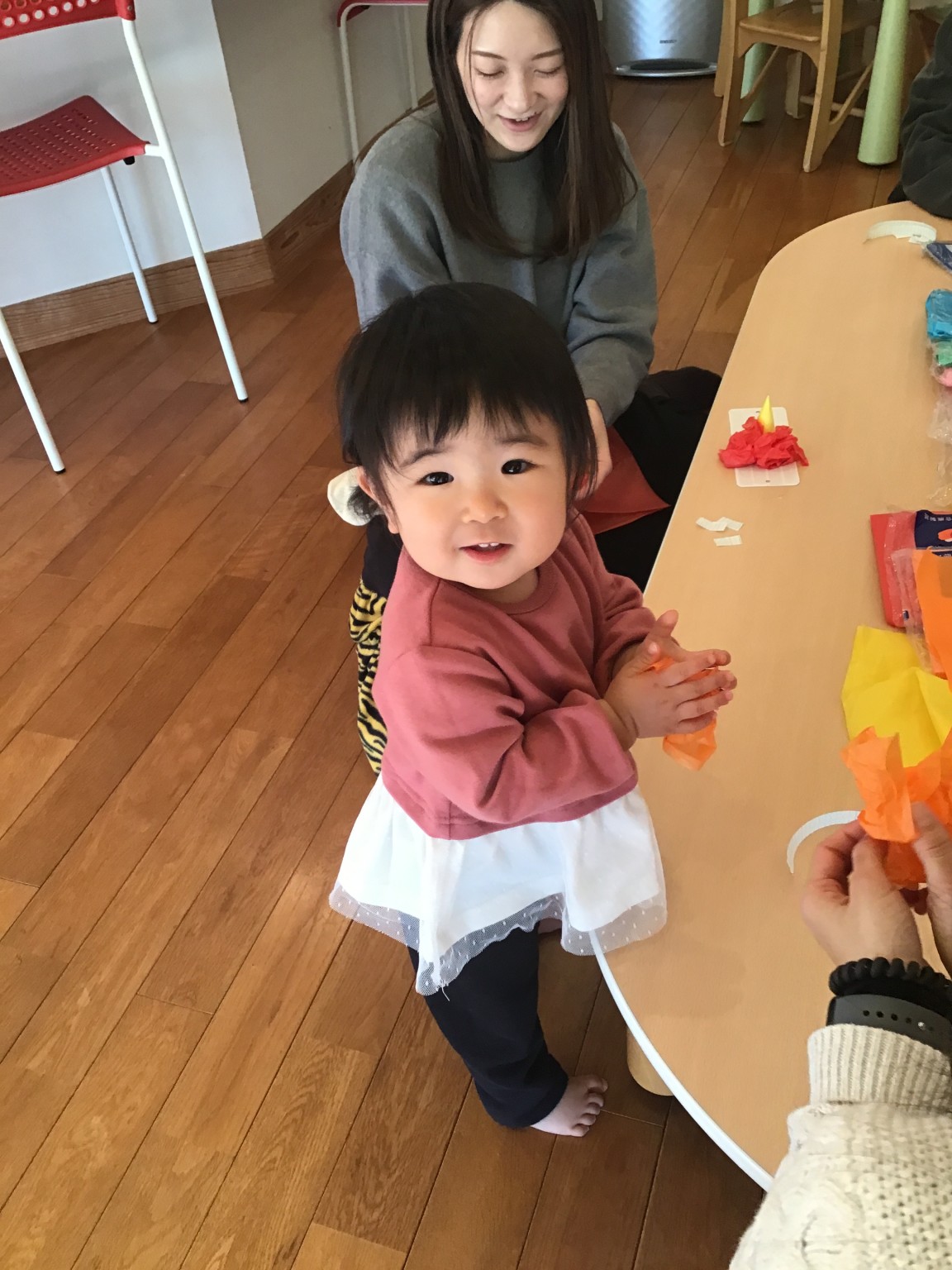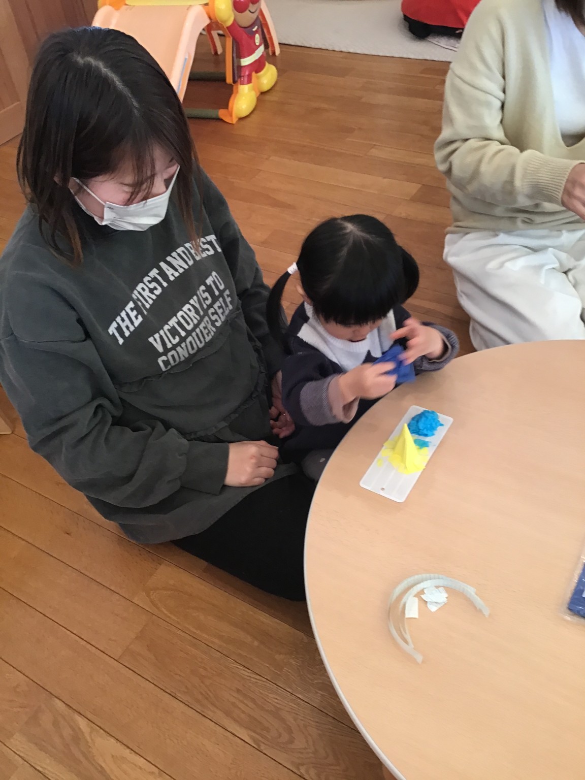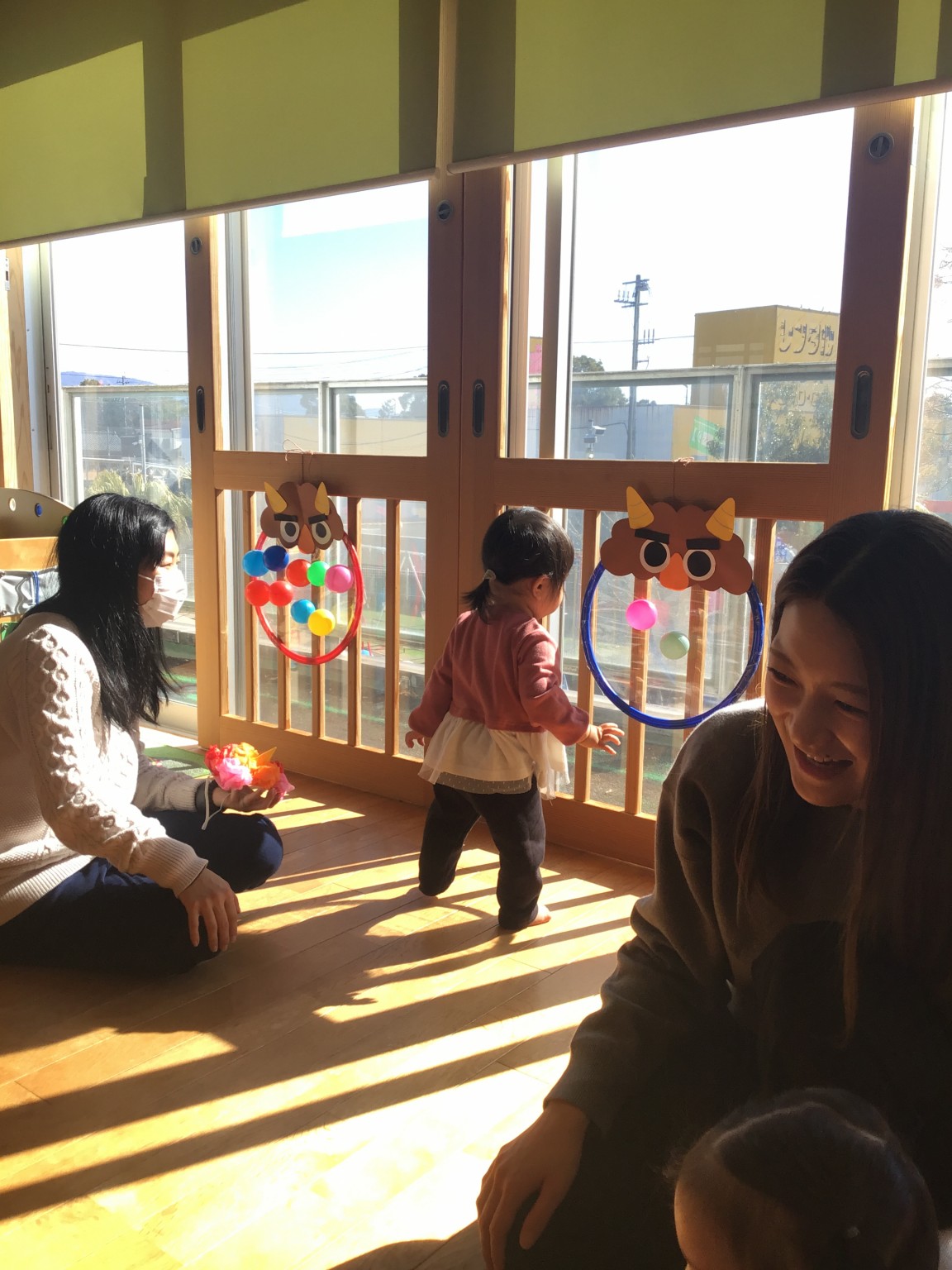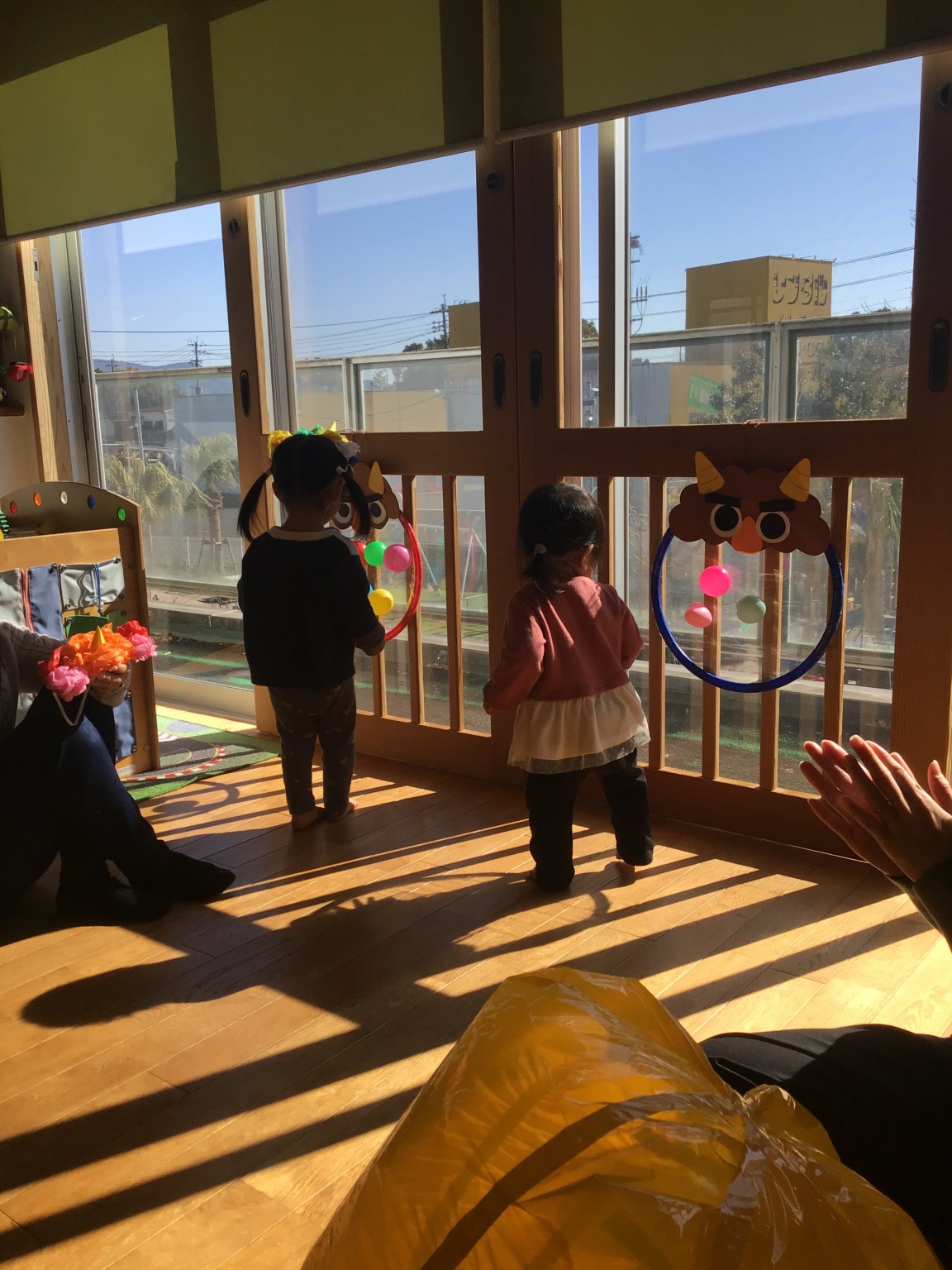 鬼のお面作り 2026年2月3日 今日は節分👹 鬼のお面作りをしました♪ お花紙を丸めてペタペタ付けると かわいい飾りが出来上がり! 鬼の飾りを頭に付けて鬼の飾りにボールを投げてくれました。 鬼の飾りを見て少し怖いーと顔をひきつらせていましたが 一生懸命ボールを投げてくれました。
