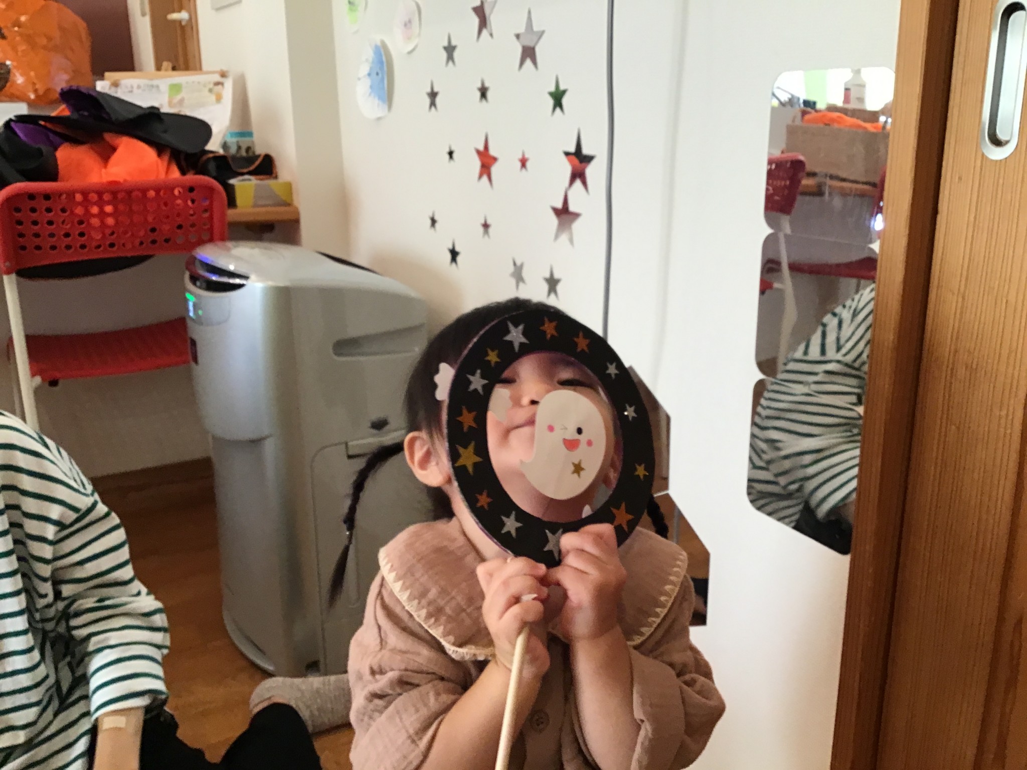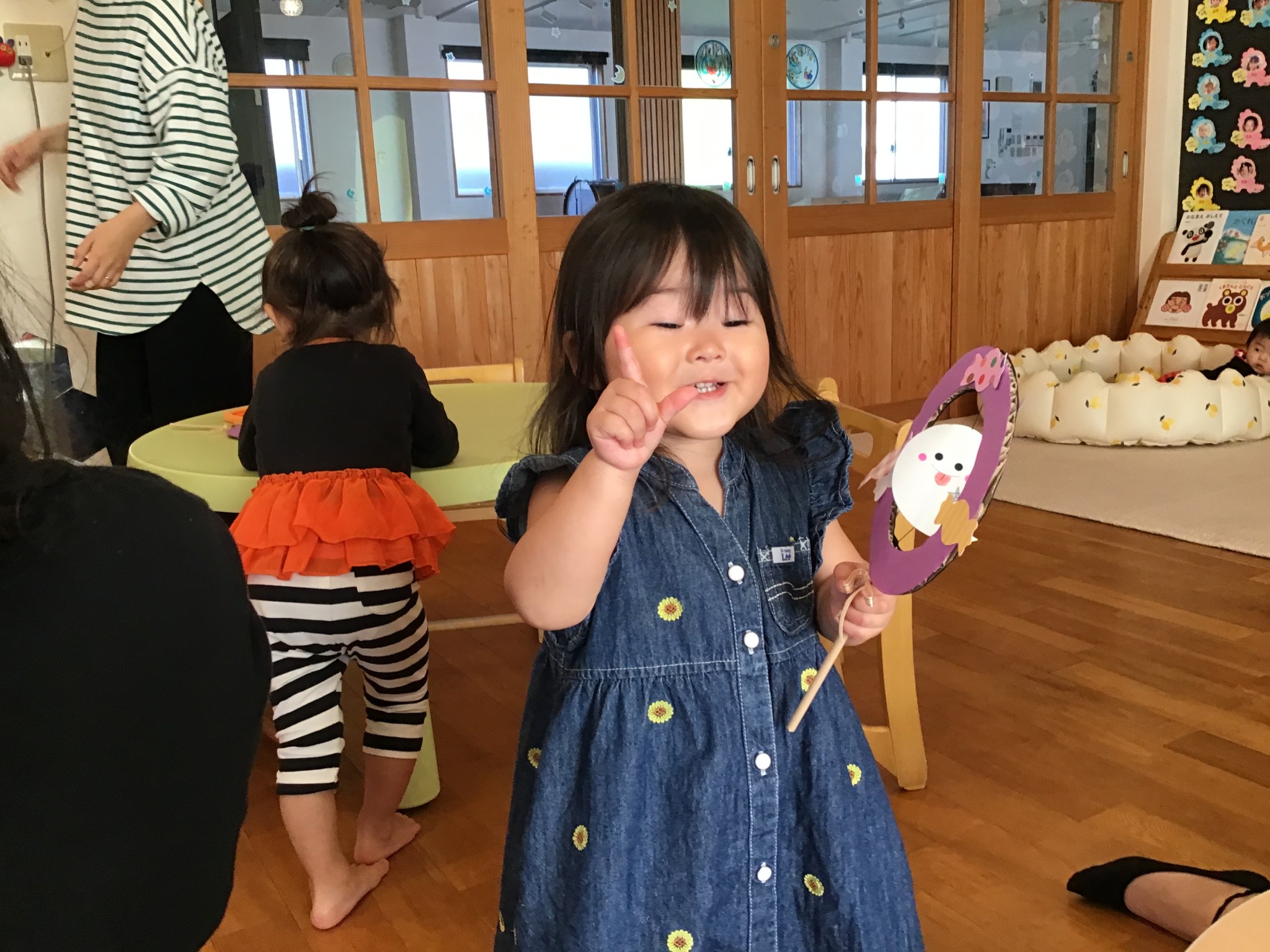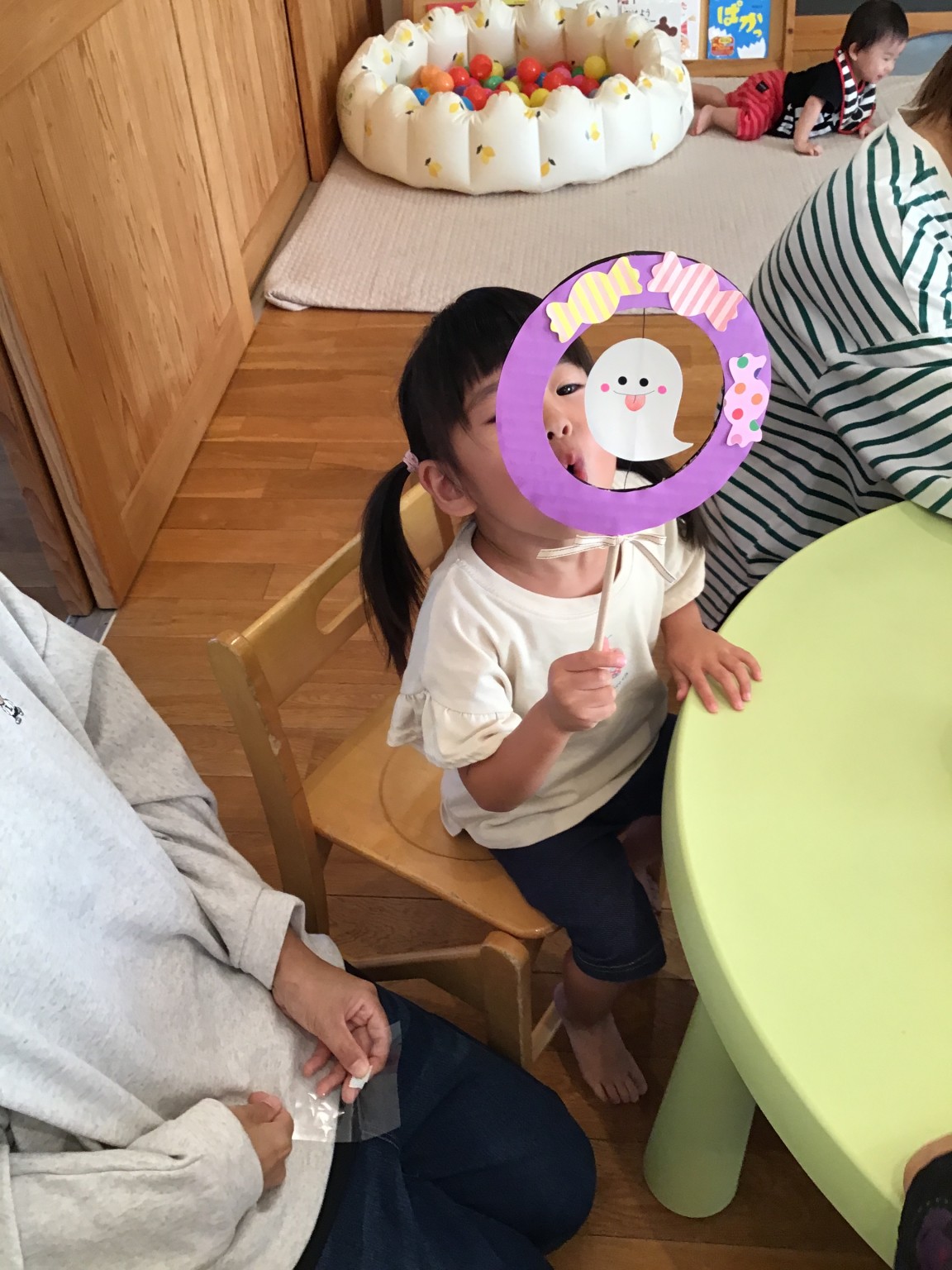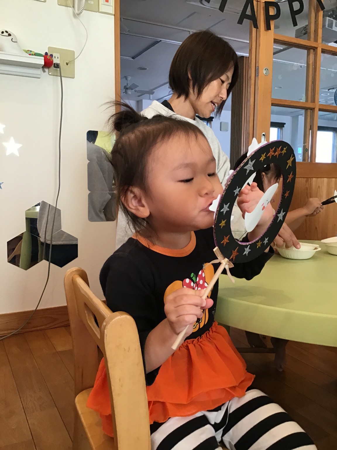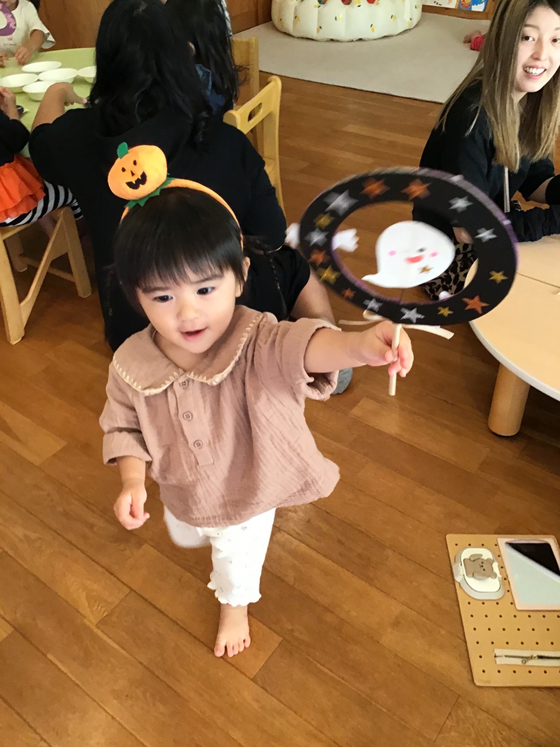 ハロウィン飾りを作ろう🎃 2025年10月27日 今日はハロウィンの日に飾れる飾り作りをしました🎃 お母さん方にジャックオーランタンの顔を 付けてもらいかわいいリースが完成しました♪ そのあとはお友達が手に持って遊べる おもちゃに飾り付けしました。 星のシールを嬉しそうに貼っていたお友達! 息を吹きかけるとくるくるお化けが回るよ👻 と伝えると一生懸命息をふーっと吹きかけてくれて とっても可愛かったです♡ 仮装もして写真撮影会もでき 楽しく過ごしました♪