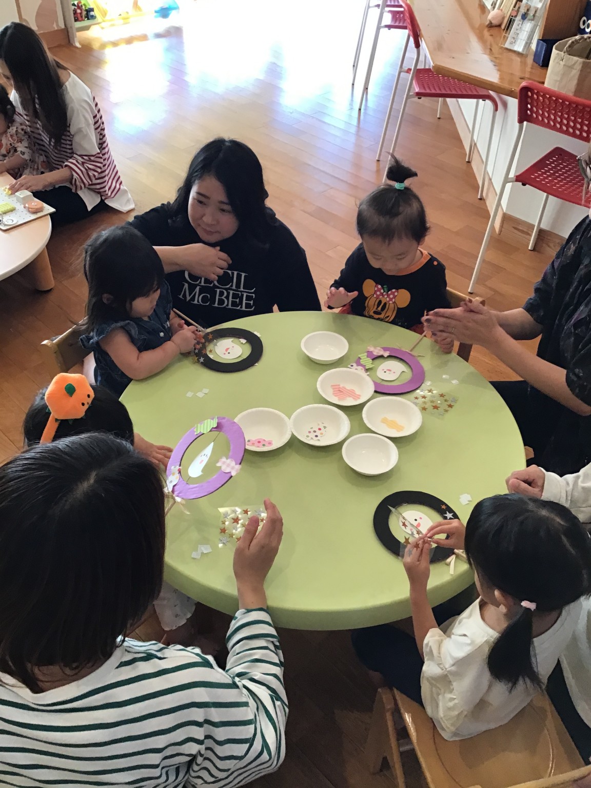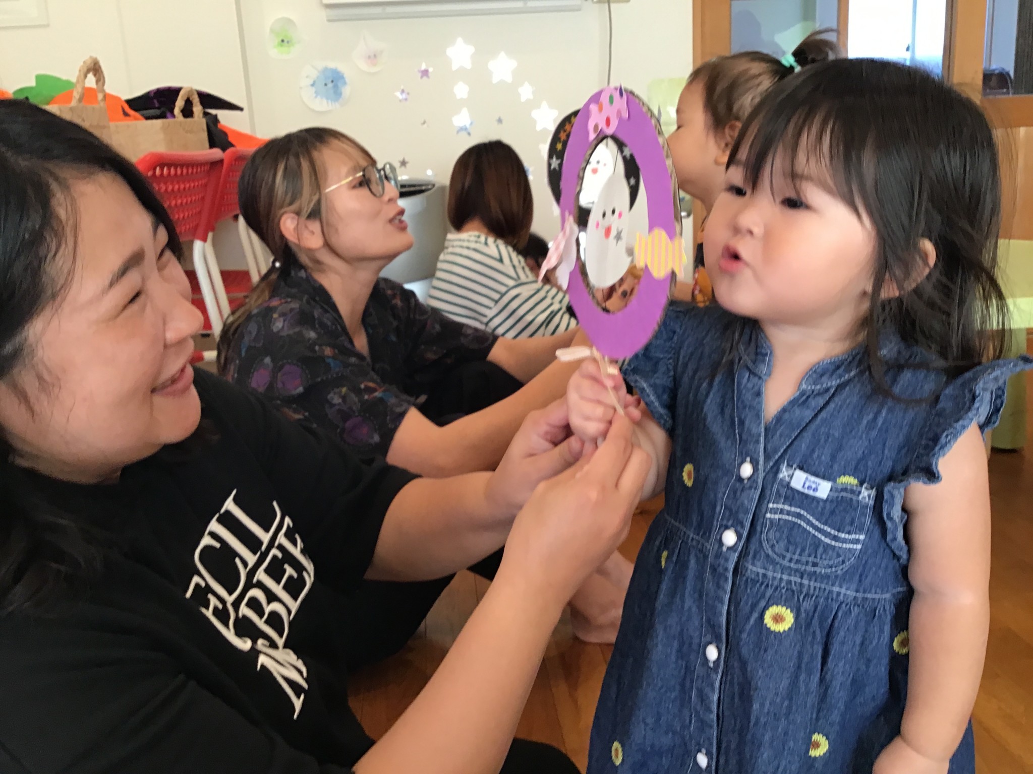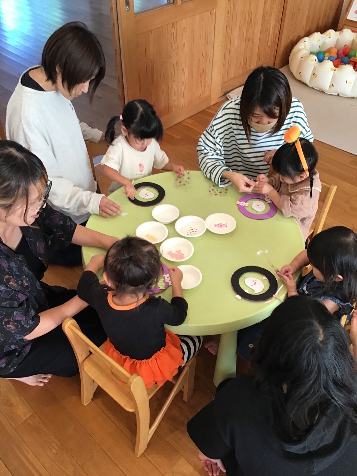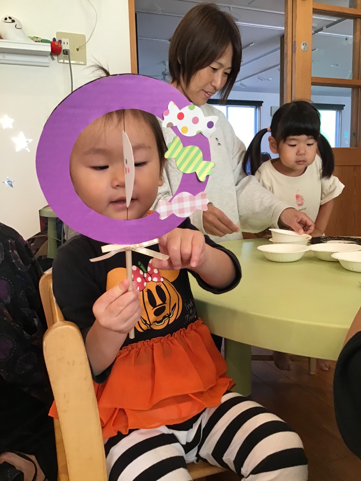 ハロウィン飾りを作ろう🎃 2025年10月27日 今日はハロウィンの日に飾れる飾り作りをしました🎃 お母さん方にジャックオーランタンの顔を 付けてもらいかわいいリースが完成しました♪ そのあとはお友達が手に持って遊べる おもちゃに飾り付けしました。 星のシールを嬉しそうに貼っていたお友達! 息を吹きかけるとくるくるお化けが回るよ👻 と伝えると一生懸命息をふーっと吹きかけてくれて とっても可愛かったです♡ 仮装もして写真撮影会もでき 楽しく過ごしました♪