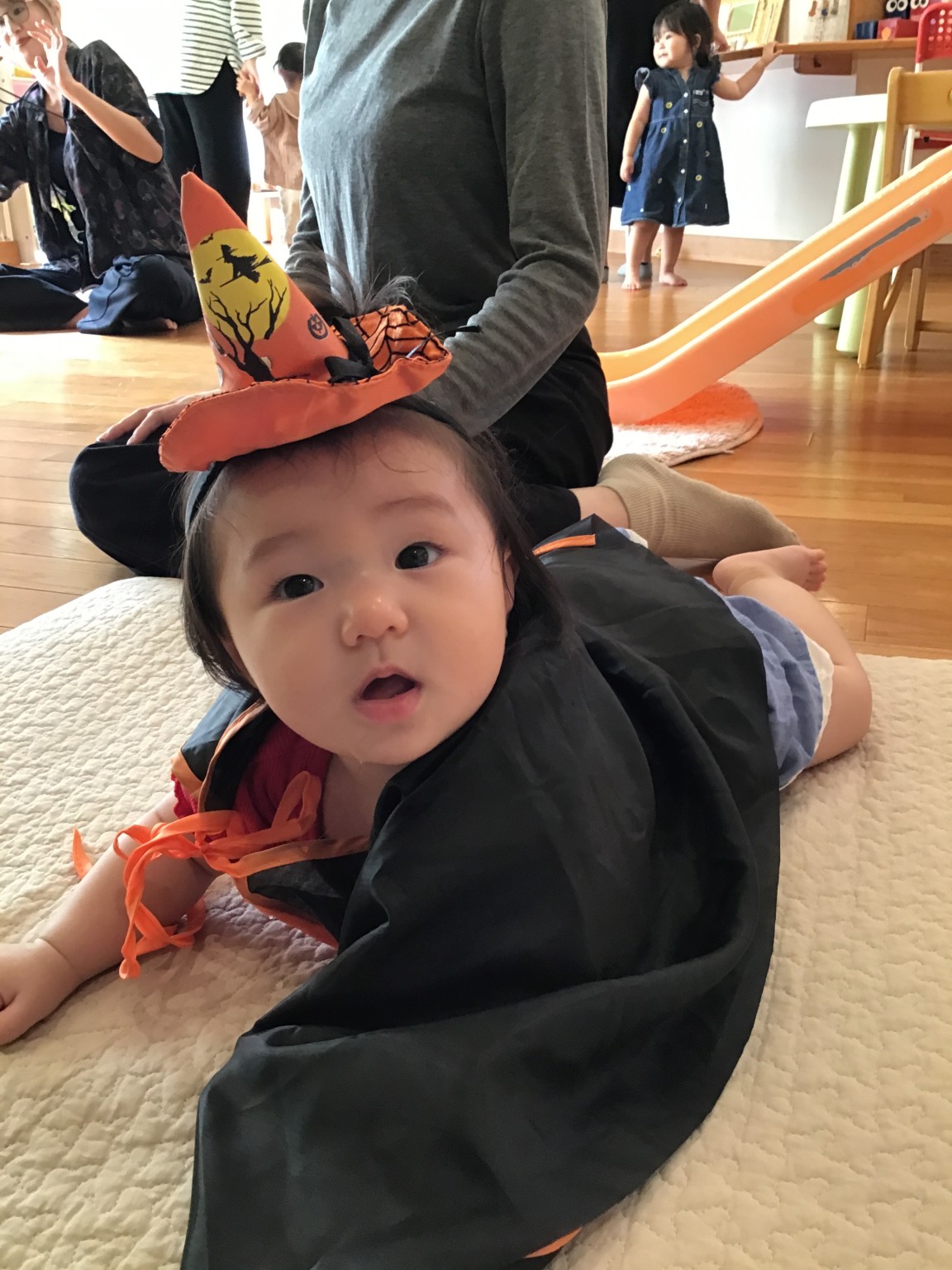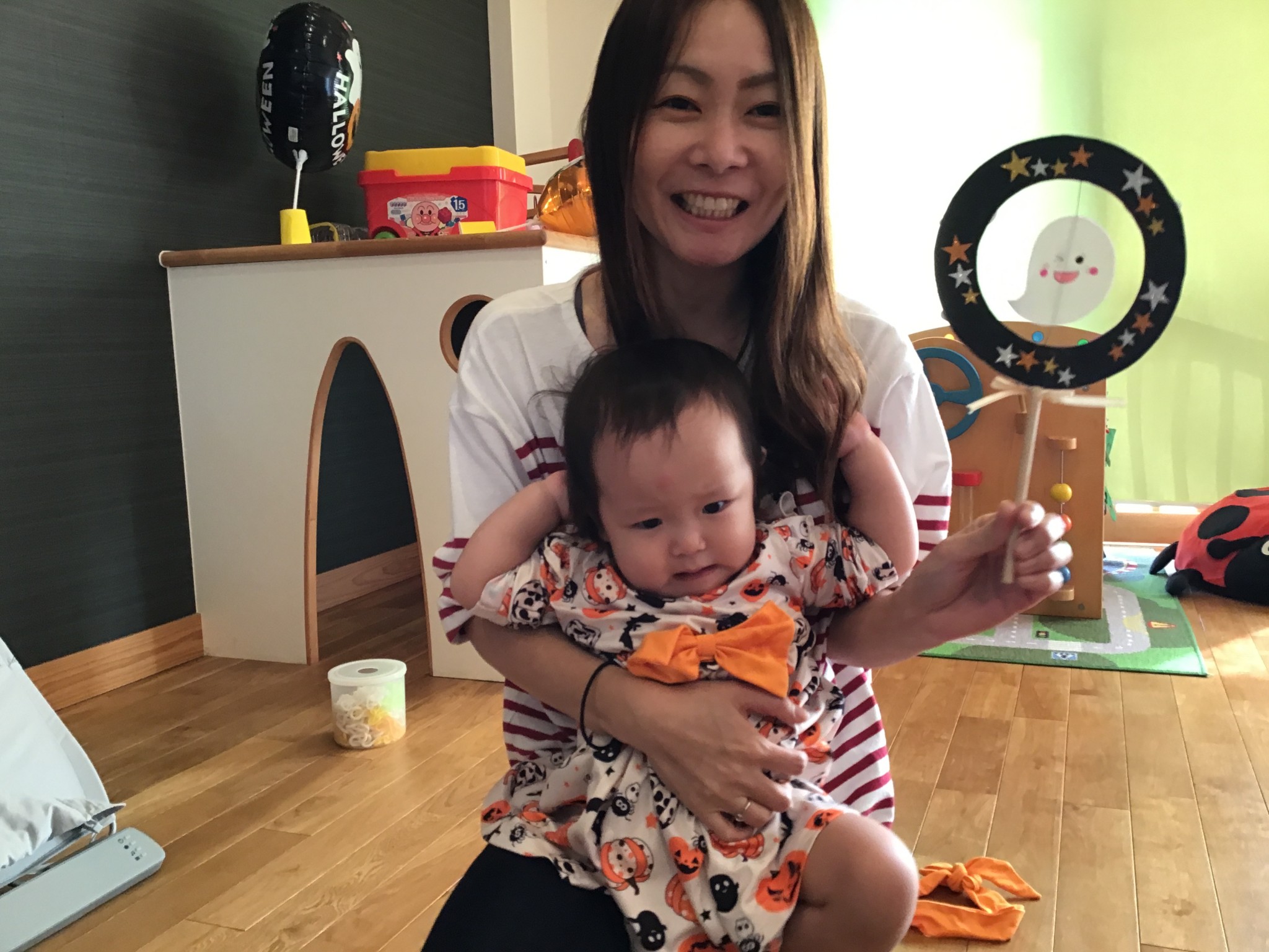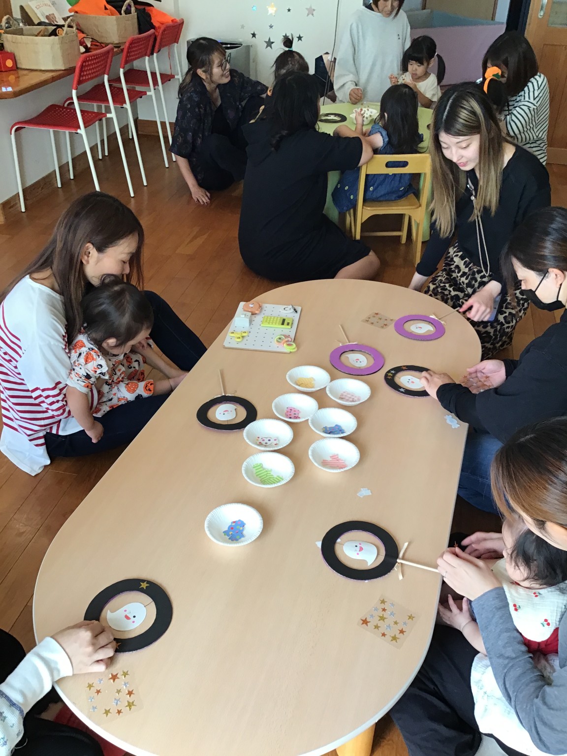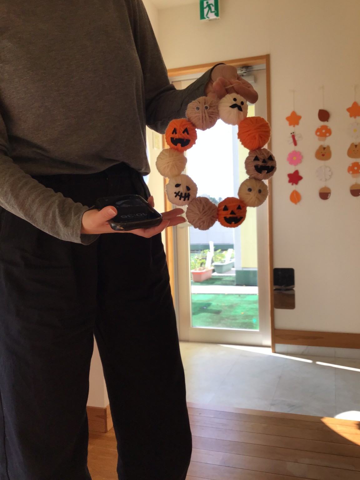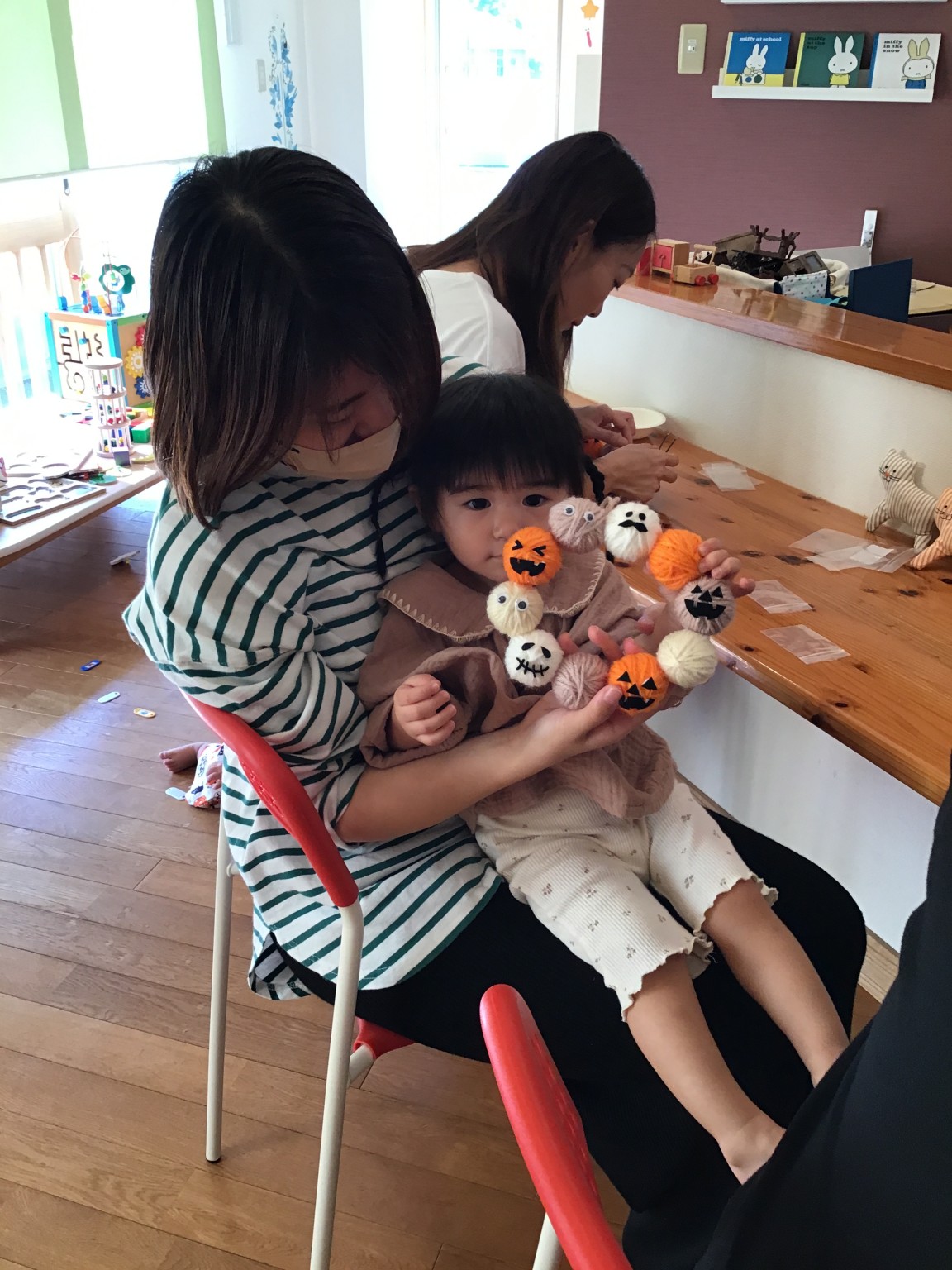 ハロウィン飾りを作ろう🎃 2025年10月27日 今日はハロウィンの日に飾れる飾り作りをしました🎃 お母さん方にジャックオーランタンの顔を 付けてもらいかわいいリースが完成しました♪ そのあとはお友達が手に持って遊べる おもちゃに飾り付けしました。 星のシールを嬉しそうに貼っていたお友達! 息を吹きかけるとくるくるお化けが回るよ👻 と伝えると一生懸命息をふーっと吹きかけてくれて とっても可愛かったです♡ 仮装もして写真撮影会もでき 楽しく過ごしました♪