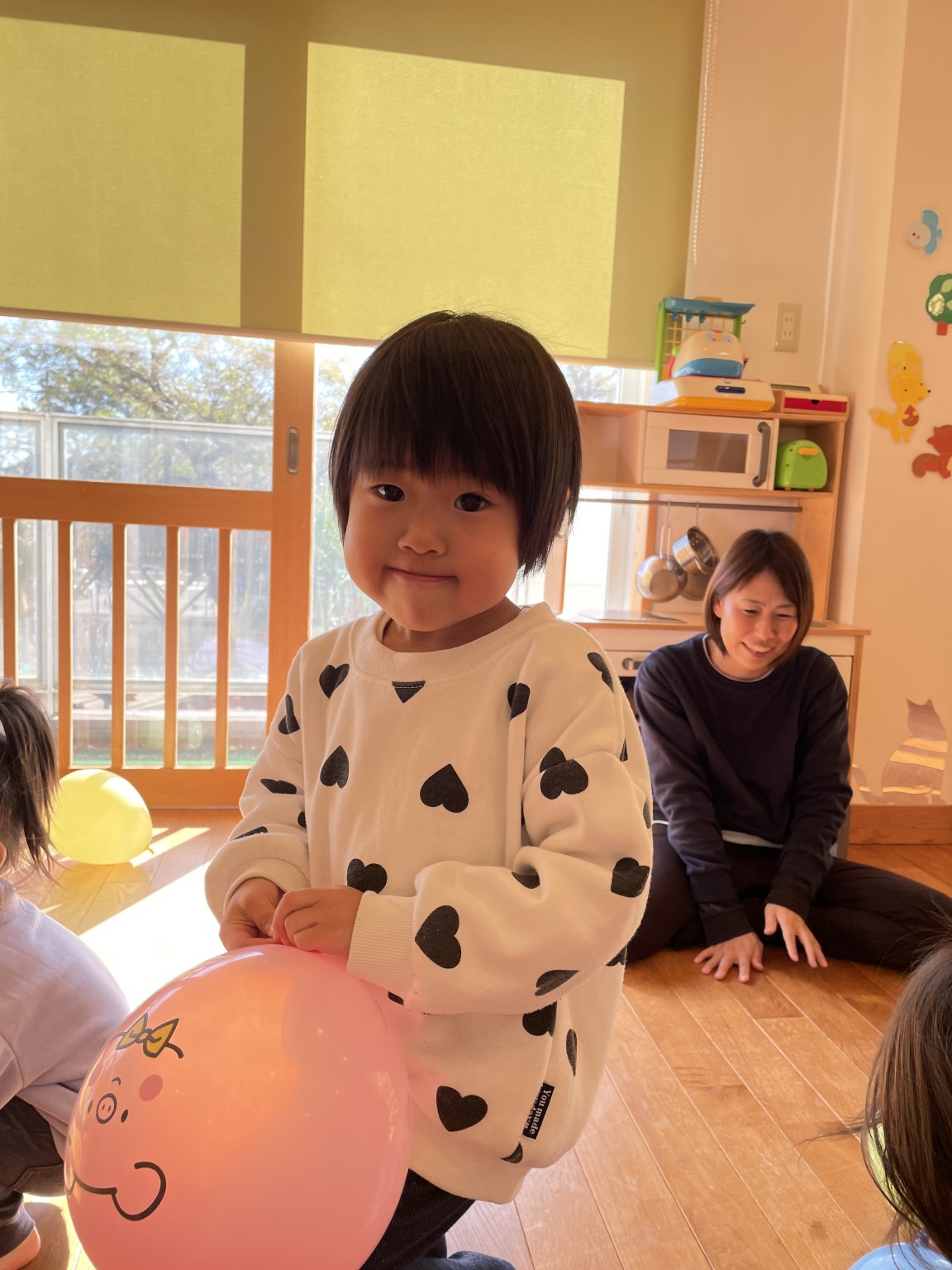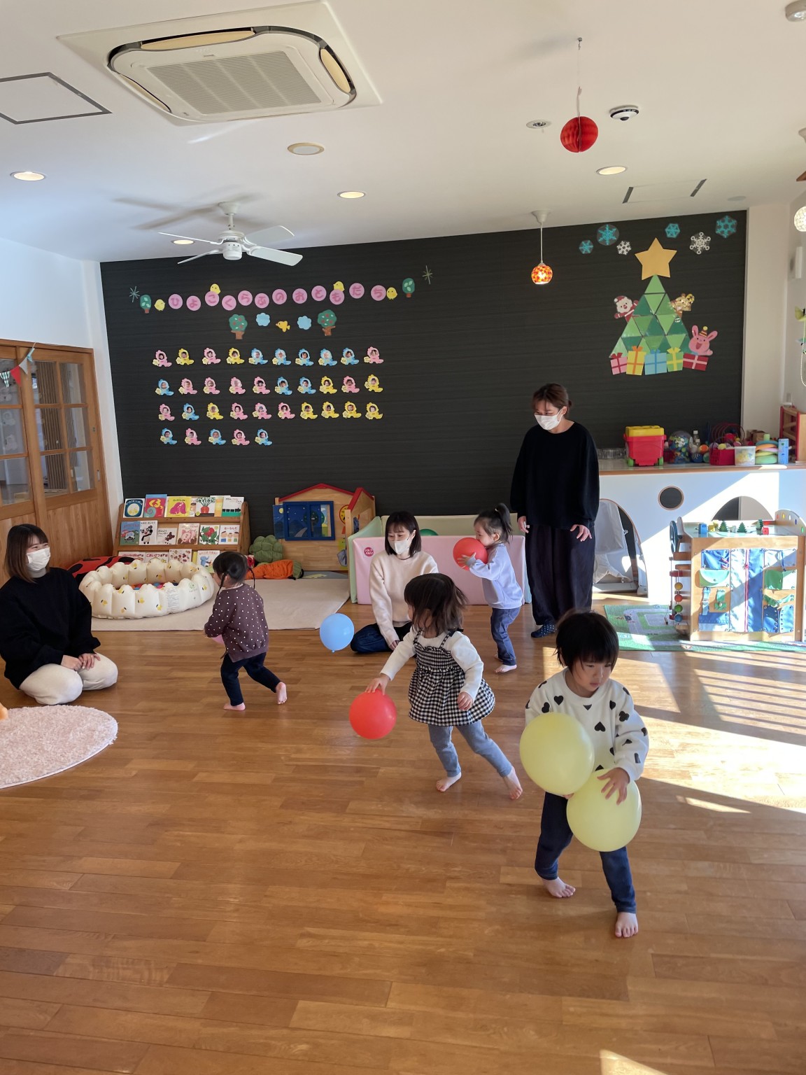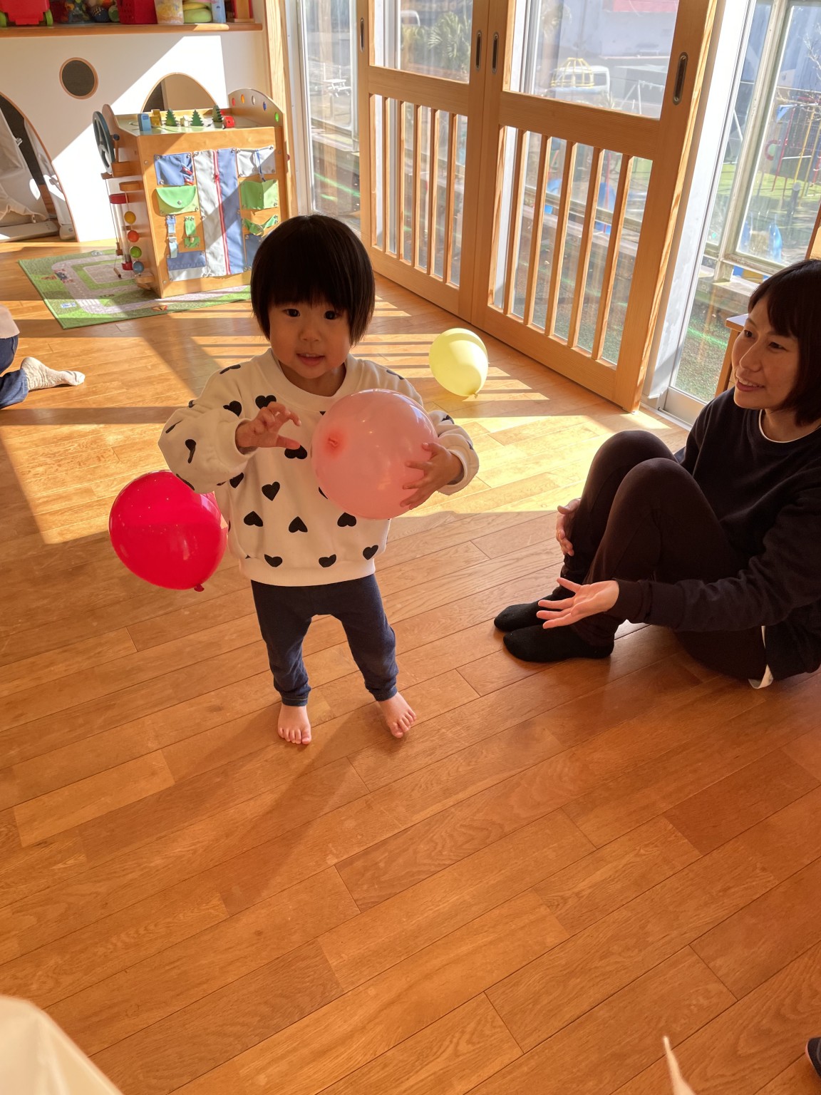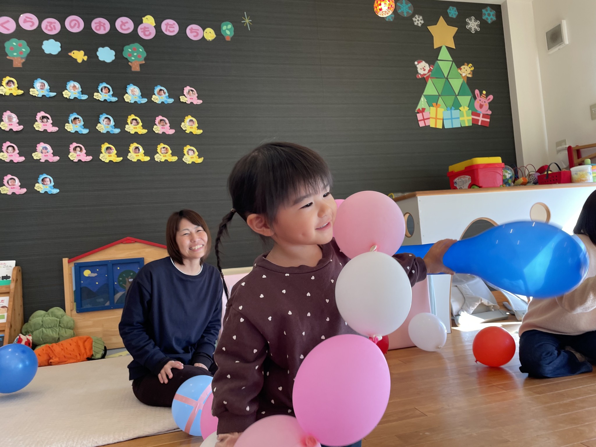 風船で遊ぼう🎈 2025年12月18日 先日の風船遊び🎈 皆んな大好き風船遊び😍 何色の風船がいい! と言って手に持つとジャンプしたり お母さんに投げたりとっても楽しそうに遊んでいました♪ 体いっぱい動かして大満足のお友達 かわいい笑顔が沢山見られました😄
