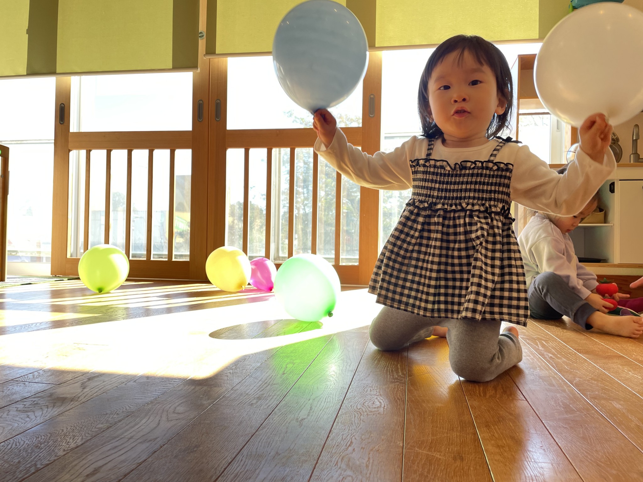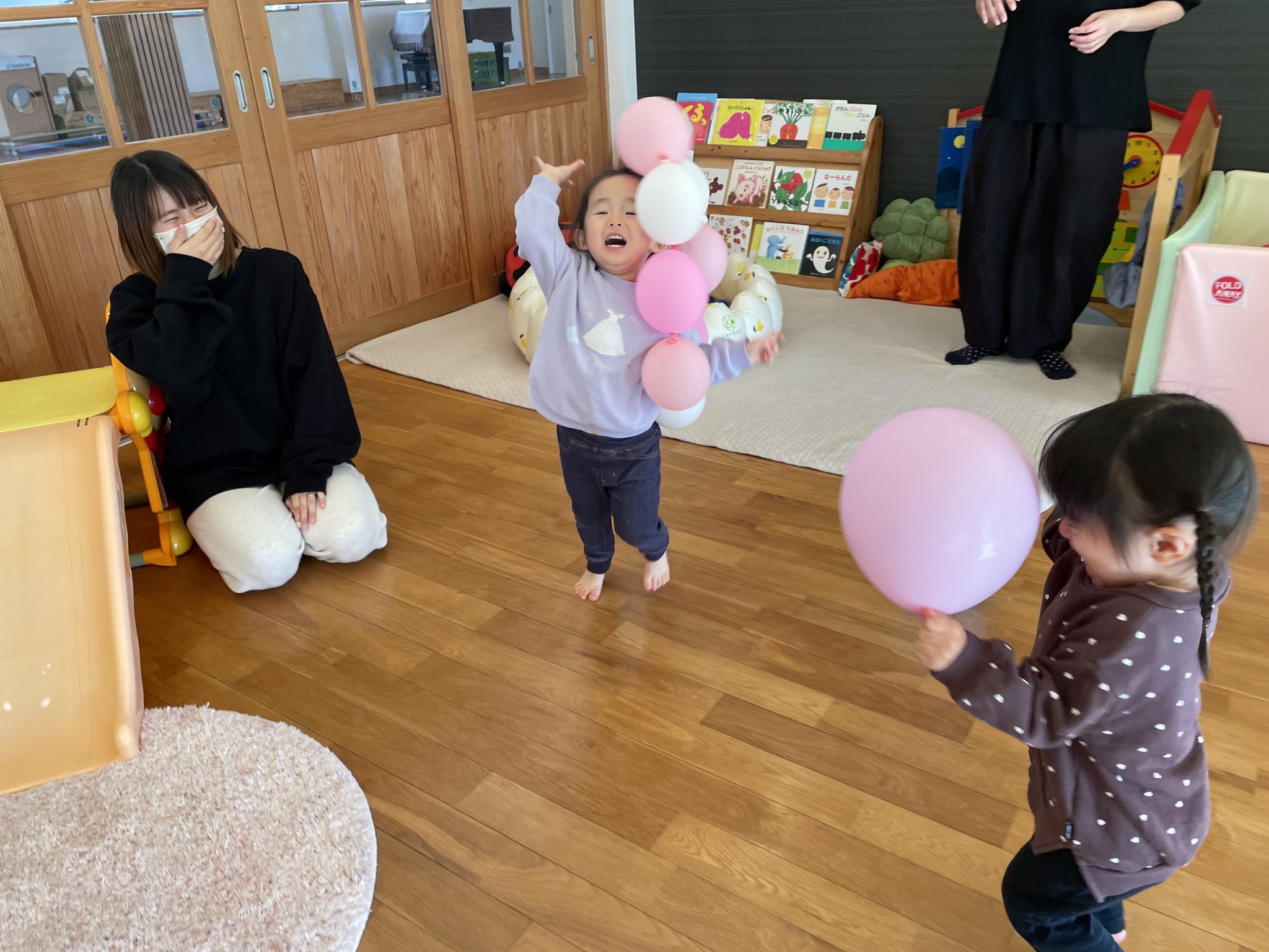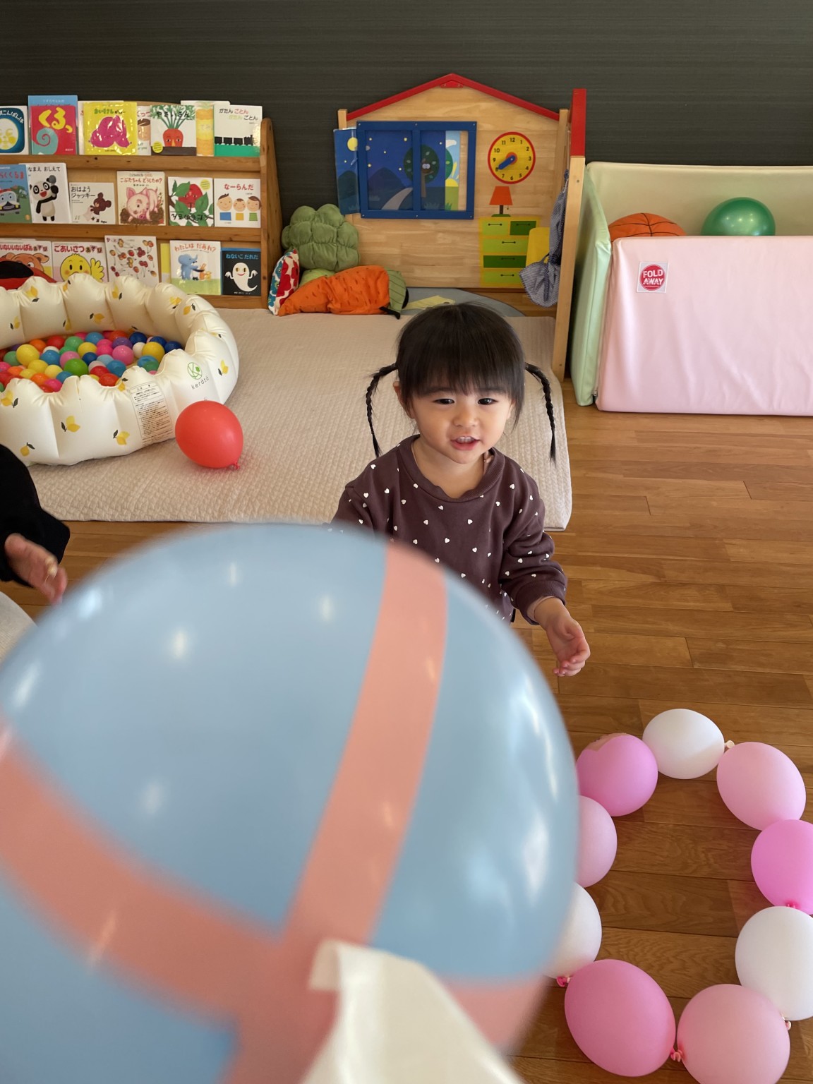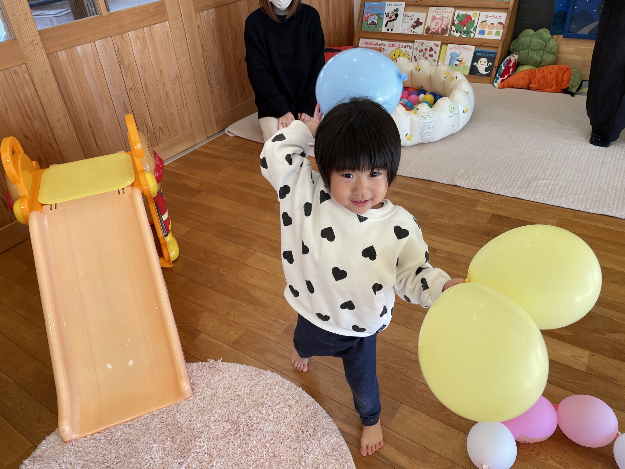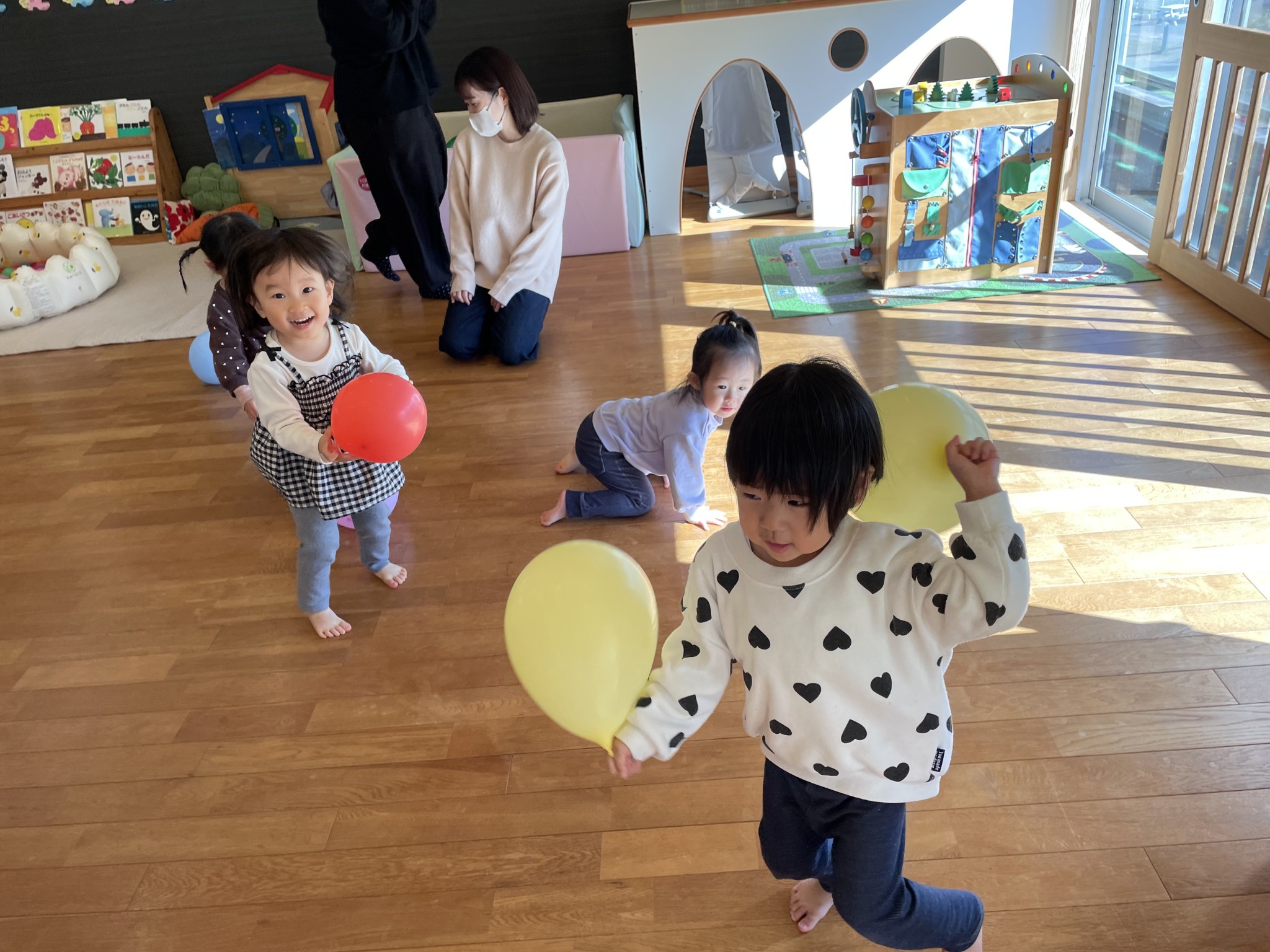 風船で遊ぼう🎈 2025年12月18日 先日の風船遊び🎈 皆んな大好き風船遊び😍 何色の風船がいい! と言って手に持つとジャンプしたり お母さんに投げたりとっても楽しそうに遊んでいました♪ 体いっぱい動かして大満足のお友達 かわいい笑顔が沢山見られました😄