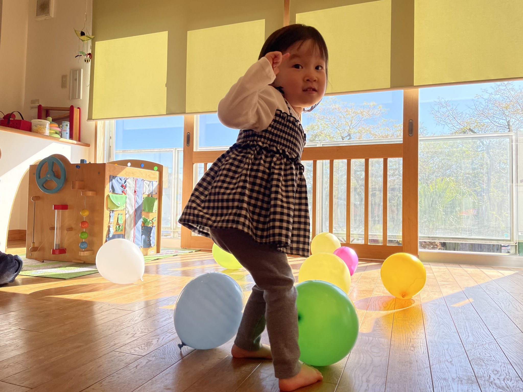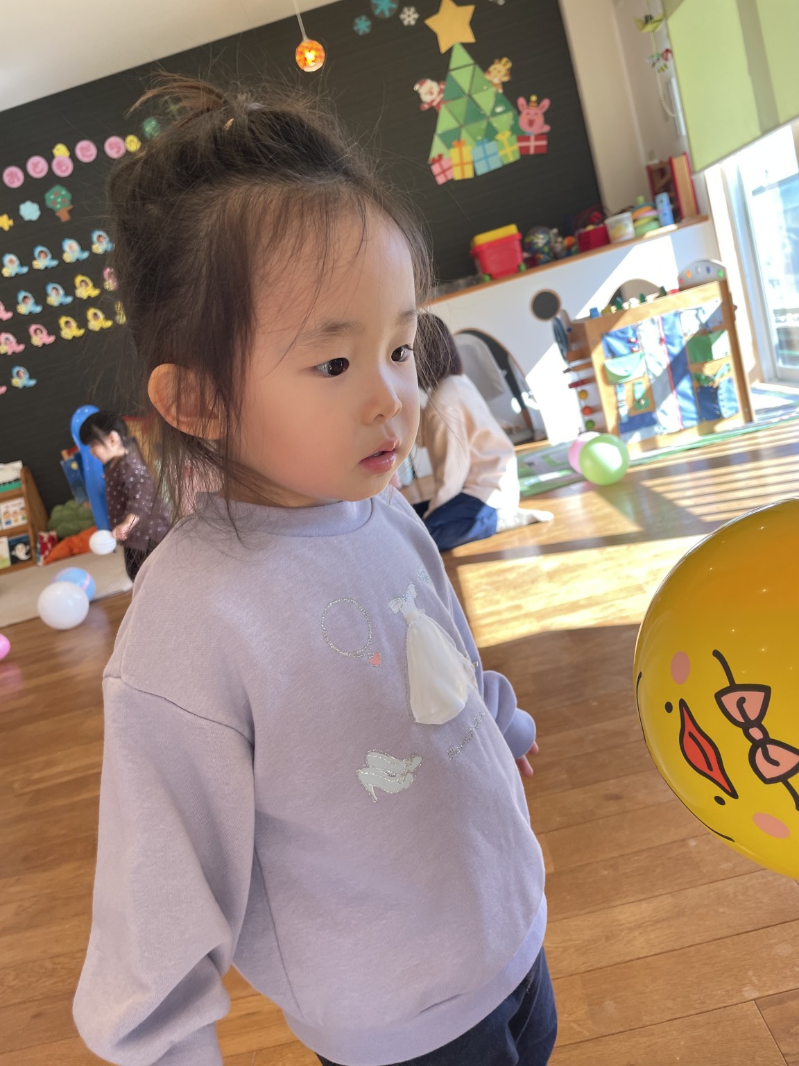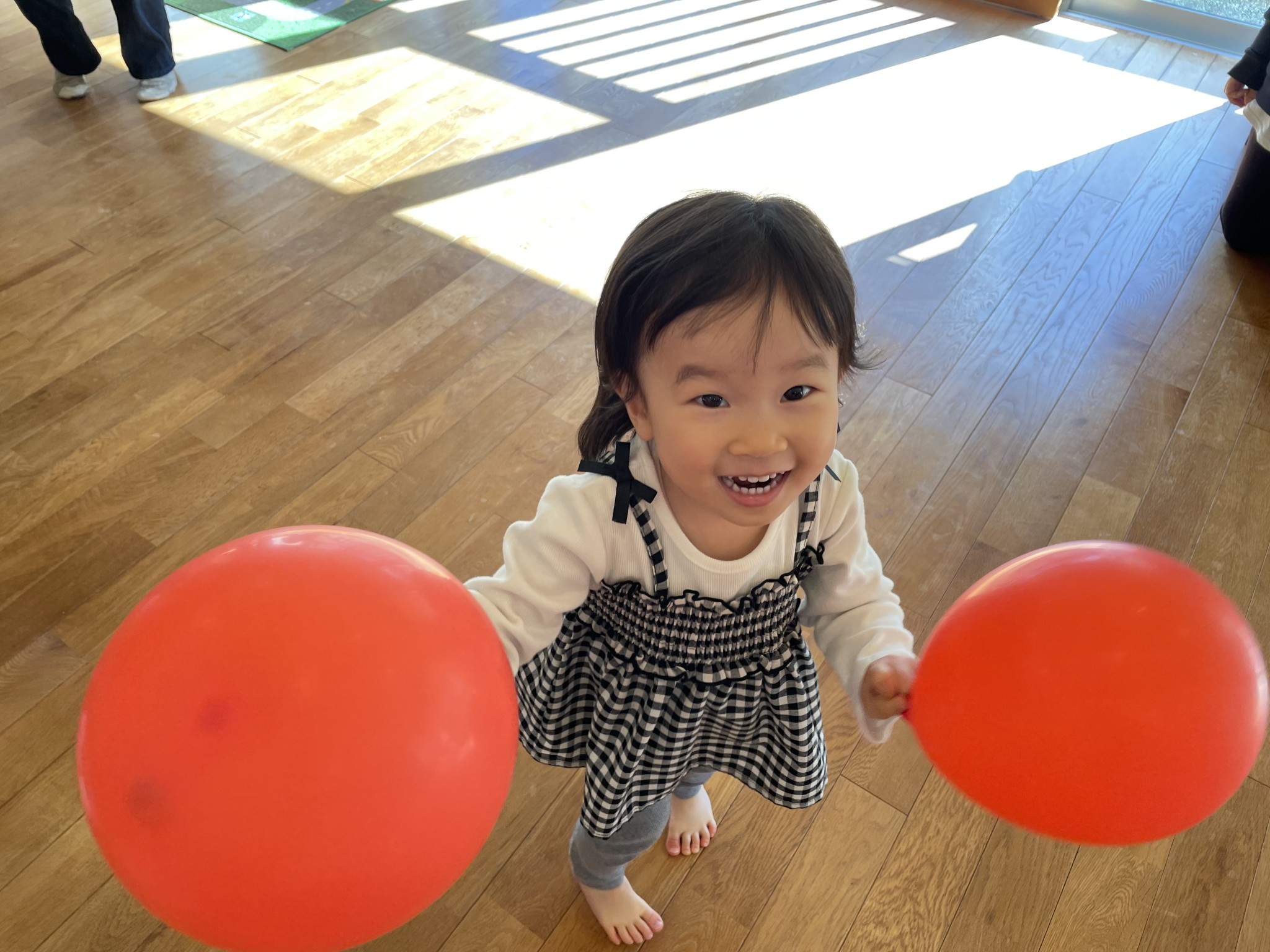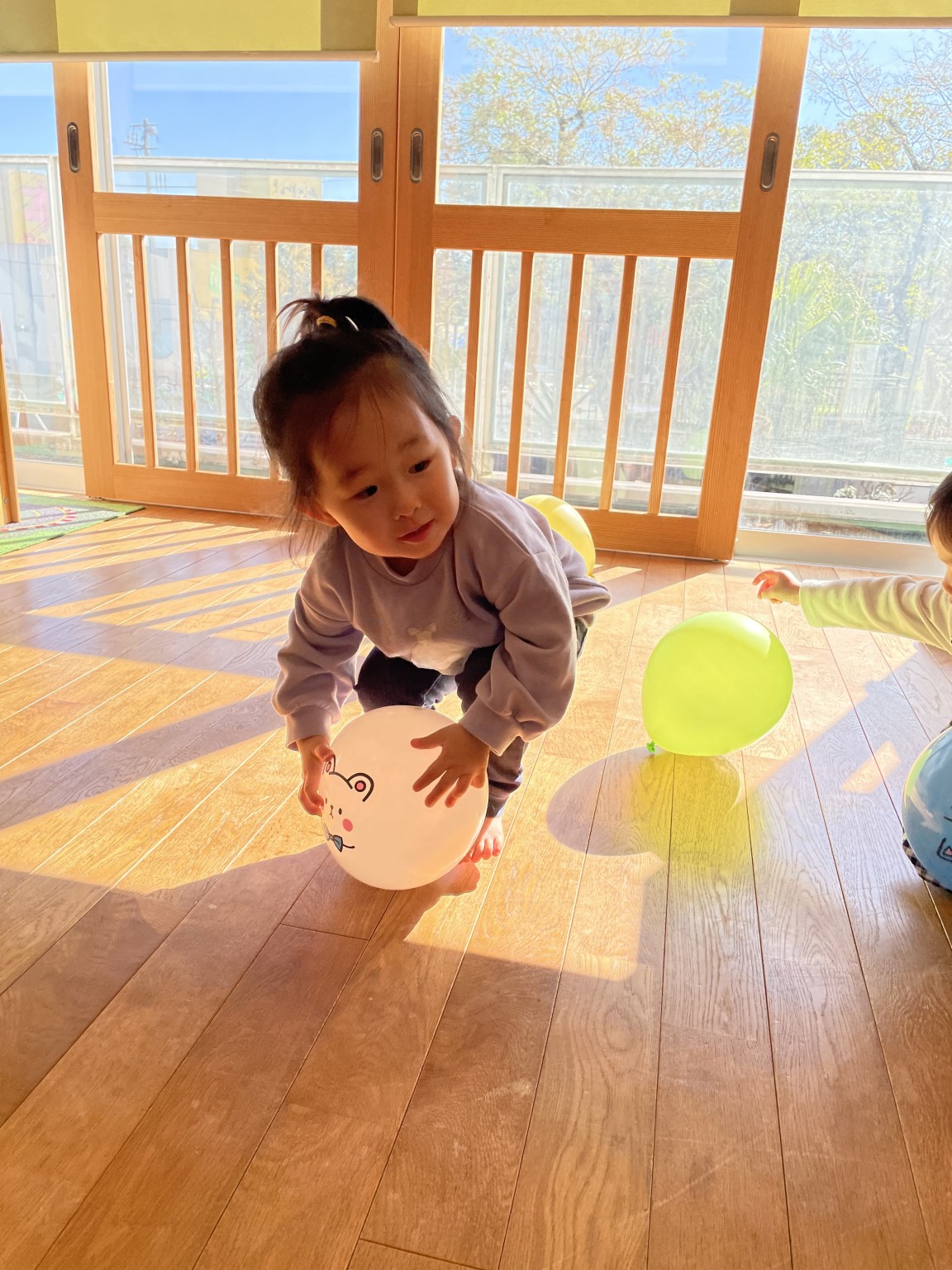 風船で遊ぼう🎈 2025年12月18日 先日の風船遊び🎈 皆んな大好き風船遊び😍 何色の風船がいい! と言って手に持つとジャンプしたり お母さんに投げたりとっても楽しそうに遊んでいました♪ 体いっぱい動かして大満足のお友達 かわいい笑顔が沢山見られました😄